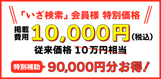 本来であれば、有料広告枠+登録や管理の人件費で、10万円相当の費用がかかりますが「いざ検索」が特別に9万円分を補助! 会員企業様は、1万円で広告掲載できちゃいます!!